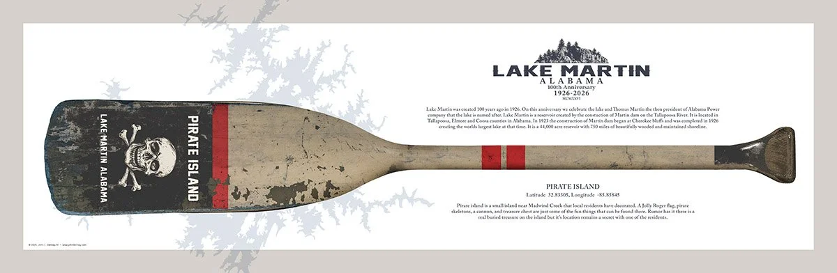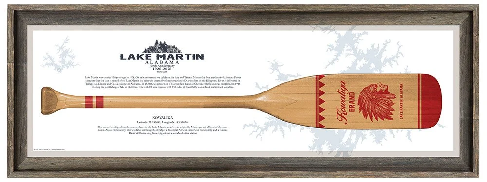These thoughtfully created prints honor the 100th anniversary of Lake Martin and the abundant wildlife native on our lake. Framed in rustic barnwood, they will add a nice touch to your cabin, game room, or guest quarters.